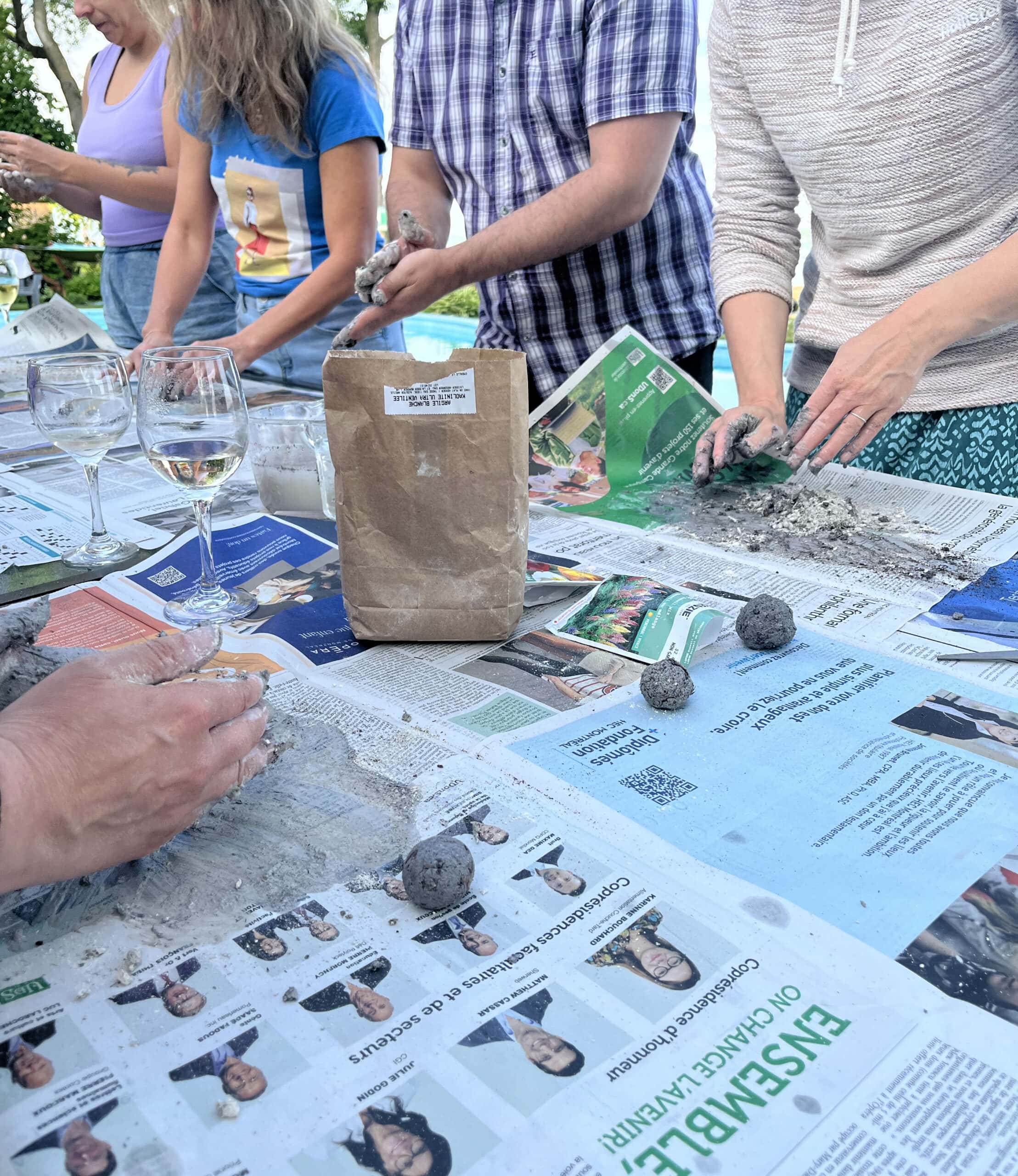 Les mains dans l’argile et dans le terreau, nous avons confectionné des bombes de semence de fleurs sauvages en nous remémorant les joies, les coups de cœur, les anecdotes vécues lors de nos expérimentations. Chacun·e notre tour, nous avons nommé ce que nous voulions conserver de cette expérience et amener avec nous dans la prochaine année. Puis, officiellement, nous avons dit adieu à nos protéquipes en repartant avec nos bombes de semences, à planter quelque part dans une craque fertile! Ce moment de rituel, simple, festif et puissant, nous a permis de rire et de prendre soin de notre rythme collectif.